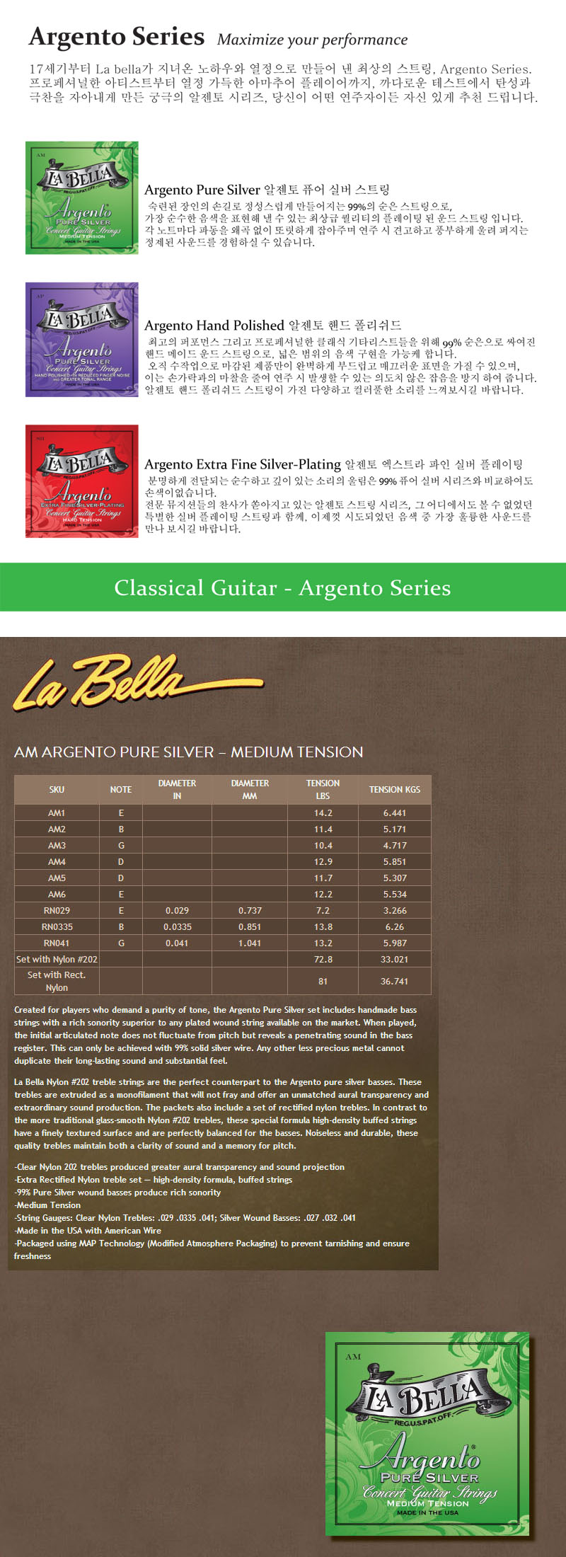 품명 / 모델명 [La Bella] AM Argento Pure Silver, Green – Medium Tension